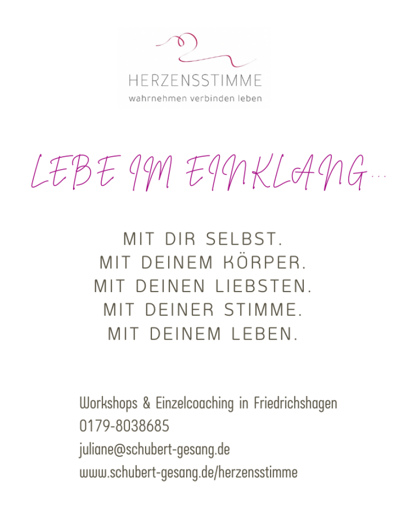 Nach jahrelangen Erfahrungen in der Arbeit mit Menschen im klassischen Gesangsunterricht und eigener Weiterentwicklung hat es mich gerufen verschiedene Formate zu entwickeln, um Menschen noch besser dabei zu begleiten den Zugang zur Stimme ihres Herzens (wieder) zu erlangen und diese authentisch auszudrücken, um neue Wege im Einklang mit ihrer inneren Wahrheit zu gehen.